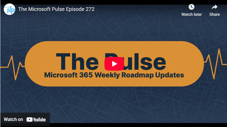Episode 272 of the Microsoft 365 Pulse Roadmap webcast is now out on YouTube. Join Jennifer Mason, Tamara Bredemus, and Thomas Duff as we cover this week’s updates.
