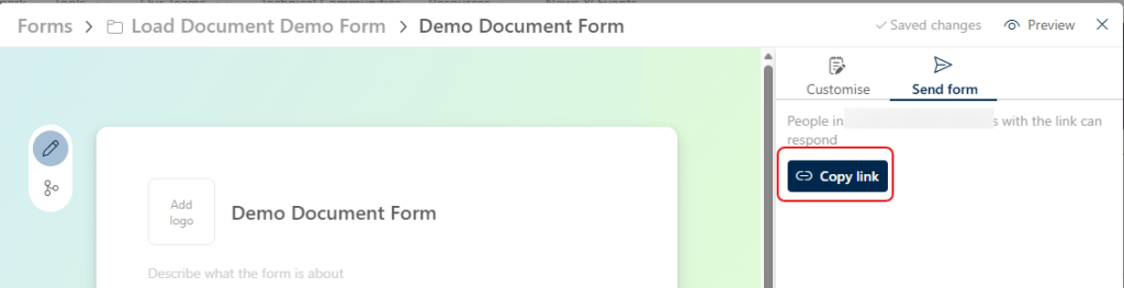 Click on Copy link to get the URL of the Form. You can put this on a SharePoint page, send in an email, post in a Teams chat, or any other option you might want: