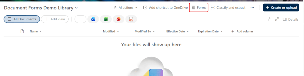 Here I have a document library where I want to use the Forms feature to collect data. To start the Forms creation, click on the Forms option: