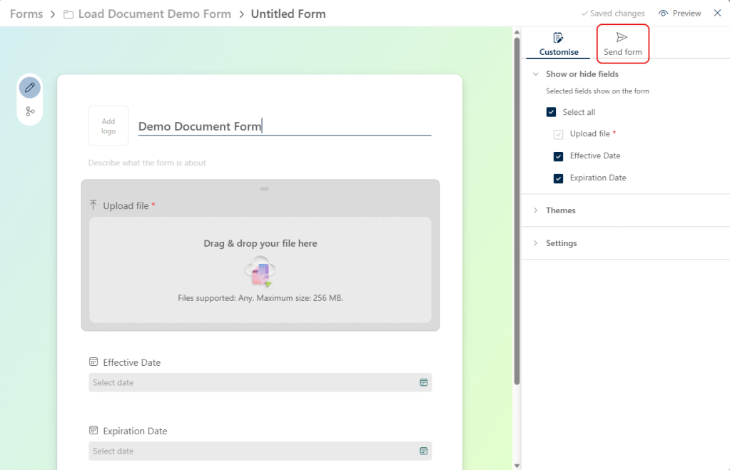 Here’s the initial Form that is created for you. Fill in the title of the form and alter any of the metadata fields you might have in the document library. It will automatically be saved when you update the form. To allow someone to use this Form to enter data you will have to send them the URL of the Form. Click on Send form: