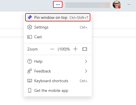 When you click on the ellipsis in the upper-right corner of the Teams client, you’ll see a drop-down menu with the option Pin window on top:
