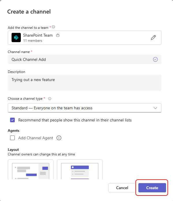 You can then fill in the details of the channel and click Create: