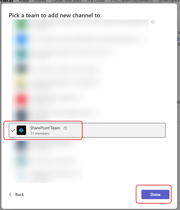 Teams will let you select any of the Teams that you have access to and/or the ability to add channels to. Pick one and click Done: