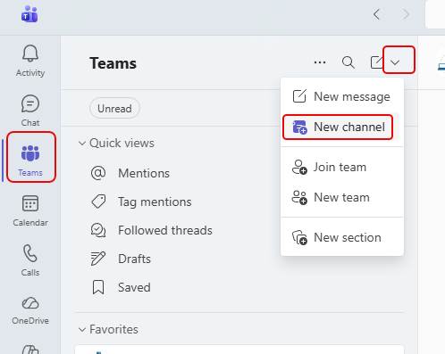When you’re in the Teams section of Microsoft Teams, click the drop-down arrow in the Activity pane and select New channel: