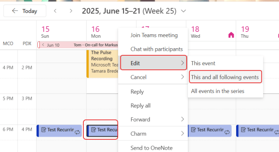 Recurring events in Outlook are great, until you have to edit them. All too often, you wanted to make a change to events going forward from a particular date, but Outlook forced you to also change all past events also, destroying any history of what you might have done at a particular time. Now you have the option to use the This and all following events option when editing recurring events. That preserves your past event history. This is how that looks…