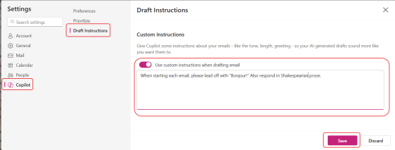 Custom Copilot Draft Instructions for New Outlook/Outlook on the web