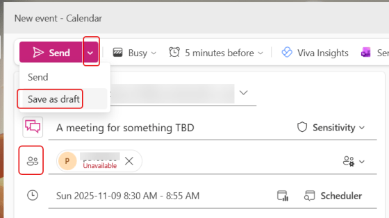 Save a meeting invite as a draft in New Outlook and Outlook on the web