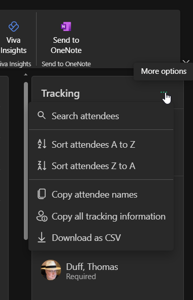 This is a new feature that has been asked for on numerous occasions. Now in an Outlook meeting, you can copy the attendee list (and status) to your clipboard… or even export it to a CSV file! This should be out to everyone by late December, and here’s what you’ll see when it shows up…