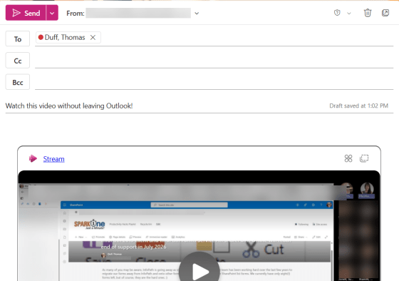 This is something that Microsoft has had on the roadmap seemingly forever, but every time I tested to see if it had been rolled out… it wasn’t. Now it is! If you put a video link in an email (and you’re using Outlook on the web), that video will show up in the actual email, and you can watch it from there without going to some other location. Here’s what that looks like…