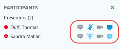 When Sandra and I hold meetings in Skype for Business, there’s almost always a discussion about who’s on mute, if someone can see the see the screen yet, etc. Actually, all that information can be found by looking at the four icons next to someone’s name.