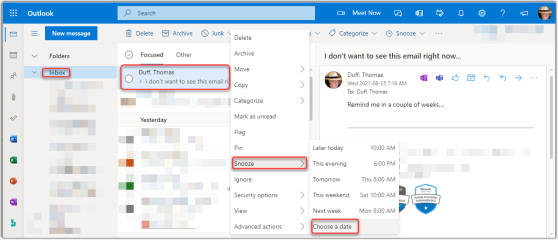 nd to live in my inbox (don’t judge), and it’s a bit irritating when you get an email that you need to act on, but not for a period of time… and it just sits in your inbox until then. Sandra Mahan showed me a better way to deal with that… Snooze! It’s possible to use the Snooze function to set a future date to have the email show back up in your inbox, and you can ignore it until then. Here’s how it works…