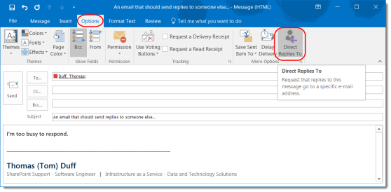 Directing your Outlook email replies to someone else