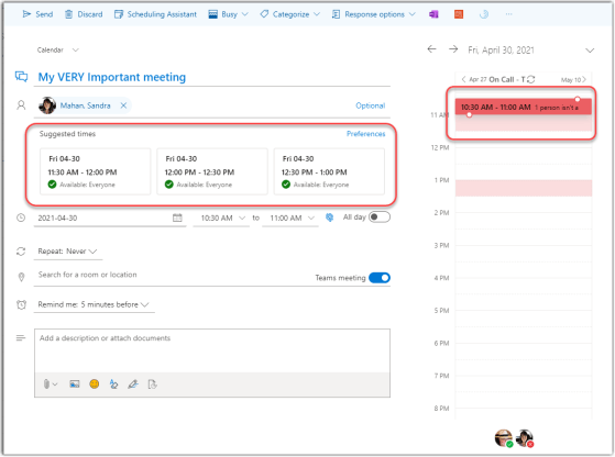This just popped up in Outlook on the Web for us today, and it’s rather cool! Now when you’re using the Outlook calendar on the web, you get a Suggested times view within the invite, and you don’t even have to go to the Scheduling Assistant! Here’s how it works…