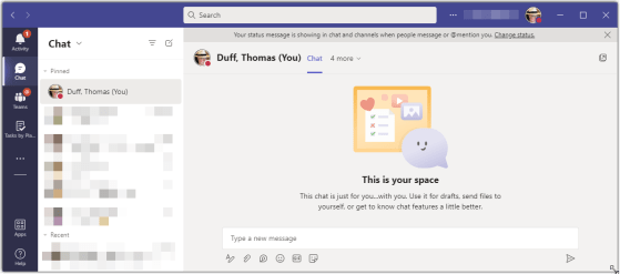 Ok… I know when most people hear about this, they’re like “why do I want to talk to myself?!?”. However, I think Microsoft’s Teams Chat With Self feature is pretty cool and gives you a different way to make quick notes to yourself. Here’s what it looks like…