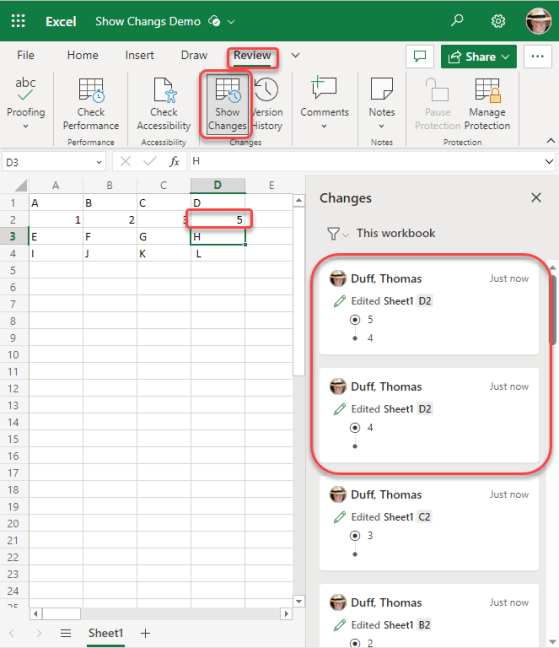 Using the Show Changes feature in Excel in the browser