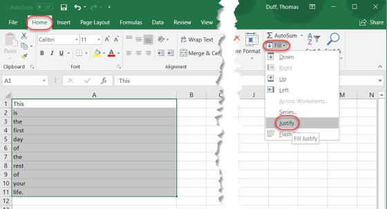 This is one of those tips you may not know about, but it will be a lifesaver if you only have to use it once. Using the Fill > Justify feature in Excel, you can concatenate data from multiple Excel cells into a single cell. It’s easy, and here’s how it works…