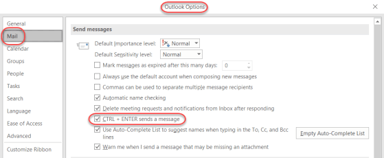 Sending an Outlook email with CTRL + ENTER keyboard shortcut