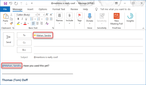 One of the new features when using Outlook is that you can @mention someone’s name in the body of the email, and it will automagically put that name into the To field of the email so you don’t forget to send it to them. Here’s how that works…