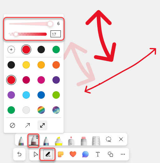 It used to be that when you were using the pen option in Microsoft Whiteboard, you were restricted when it came to line thickness and color opacity. No longer! You now have many more options in that area. Here’s what the new Ink Color Picker looks like…