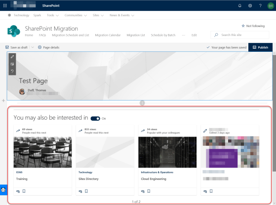 This is a new feature in SharePoint Online that will help people find content related to their specific interests based on prior page views and activities. It’s the News and Page Recommendations feature that is added to the bottom of newly created pages in SharePoint Online.