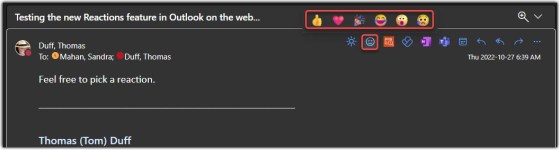 Email Reactions is a new feature (in Outlook on the Web) that allows you to quickly give feedback on an email without doing a reply or reply to all… think of it as similar to the “Like” feature on Facebook. Here’s how it works…