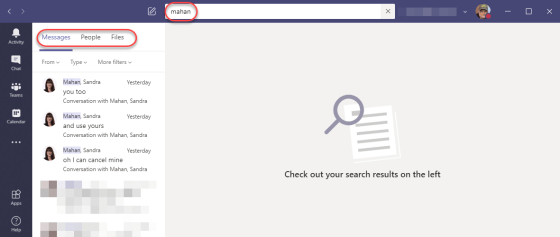 It used to be when you searched for something in Microsoft Teams, you got the results in the Feed section, and you had to scroll through the feed to find what you were looking for. Now, the search results are in the main display area, conveniently broken out by People, Messages, and Files. Here’s what it looks like…