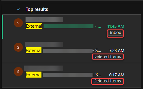 This is yet another reason why I really like using the browser-based version of Outlook. When searching, it automatically shows you the folder where the item was found. Here’s what that looks like…