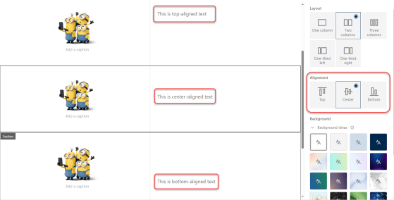 By default, content in 2- and 3-column sections in a SharePoint page always put the content at the top of the section. This could lead to “less than appealing” page layouts if you had a larger image with just a small amount of text in the second column. You ended up with a lot of white space that couldn’t be used for anything. Now, you have the option to pick the alignment of content along the top, center, or bottom. Here’s how that works…